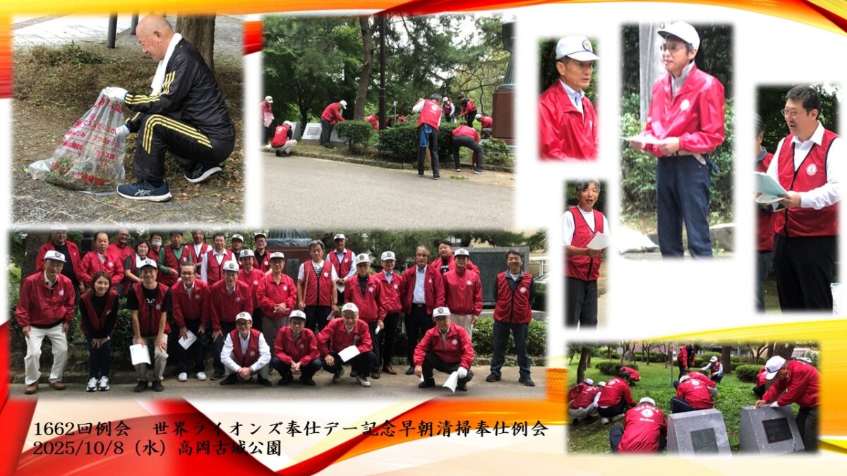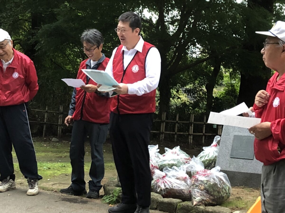 本日は早朝より、ライオンズ奉仕デー記念清掃例会にご参加いただき、誠にありがとうございます。皆さまの奉仕の心と行動力により、地域の環境が一段と清潔感を保つことができます。朝の限られた時間に、共に汗を流してくださったお一人おひとりに、心より感謝申し上げます。今後とも、ライオンズらしい温かい奉仕活動を重ねてまいりましょう。