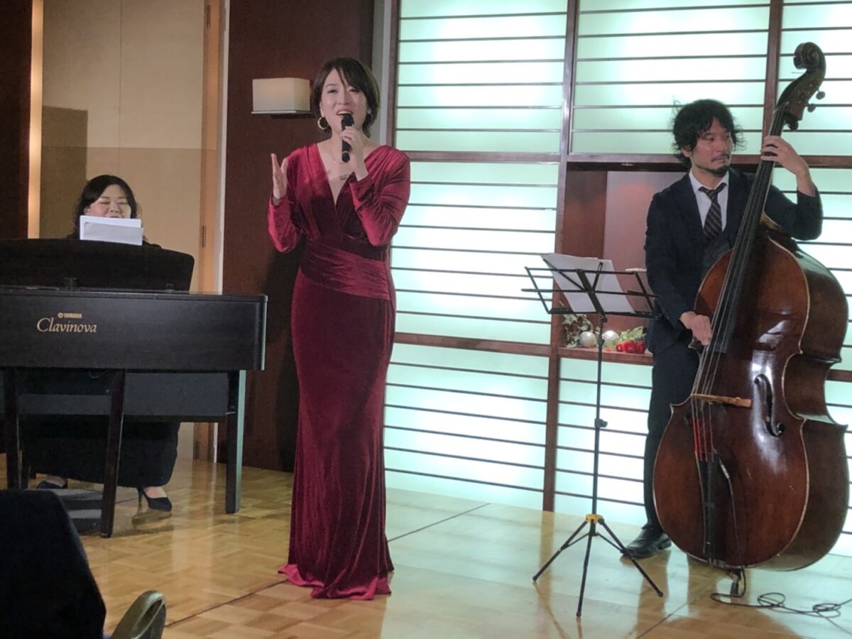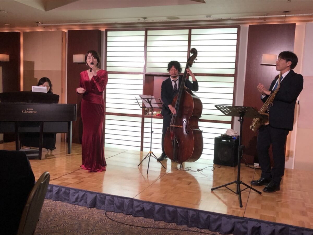| 今宵のアトラクションは、洗練された大人のひとときを彩ってくださるジャズグループの皆さまです。北陸を拠点に活躍される精鋭ミュージシャンによる、珠玉のジャズやポップスの名曲の数々をお楽しみいただきます。心地よいリズム、豊かなハーモニー、そして即興が生み出すライブならではの躍動感——スタンダードからお馴染みの名曲まで、しっとりと、時に情熱的に。サックスの温かな音色、ピアノの繊細な旋律、ベースの深いグルーヴ、そしてボーカルの華やかな歌声が重なり合い、皆さまを非日常の音楽空間へと誘います。どうぞグラスを傾けながら、極上のジャズのひとときを心ゆくまでお楽しみください。 篠崎文(しのざき あや)with リバーズトリオのみなさんです。それではお願いします! |