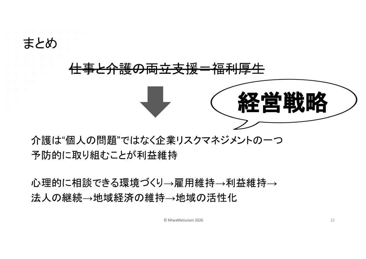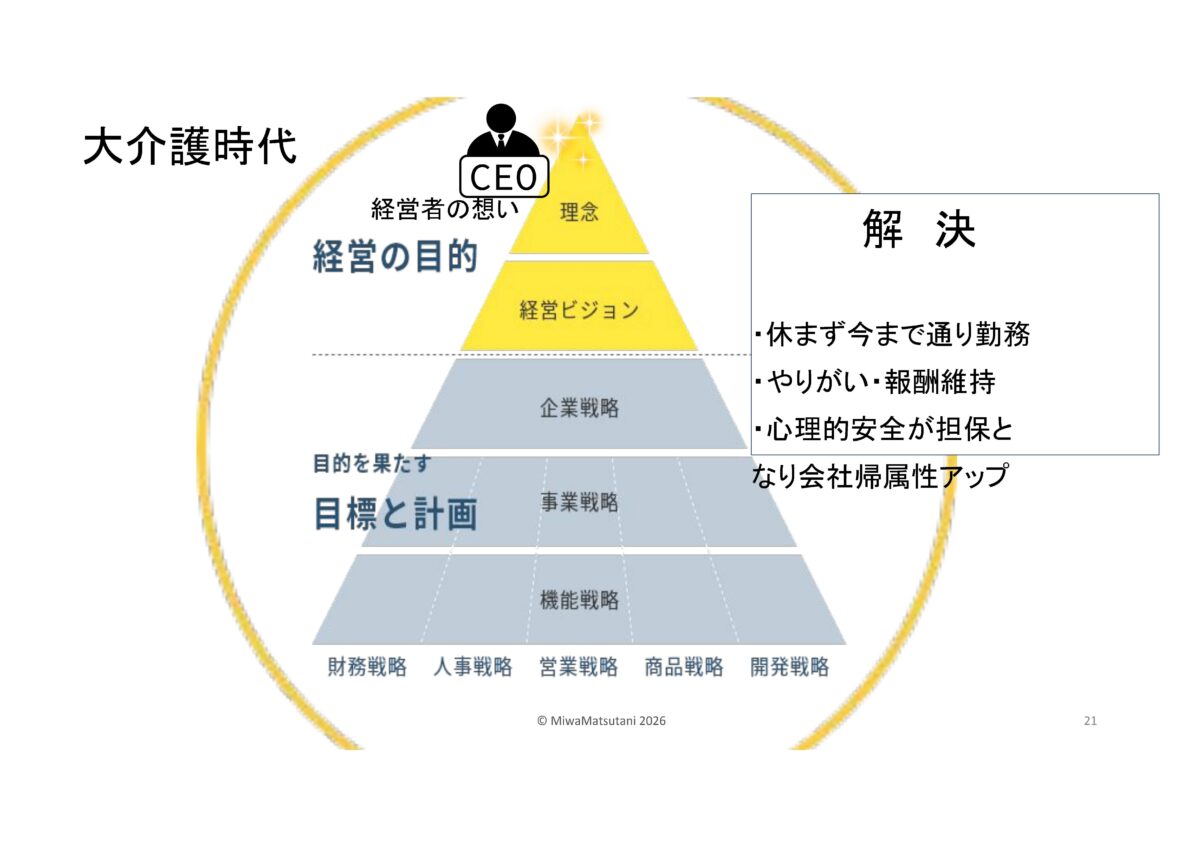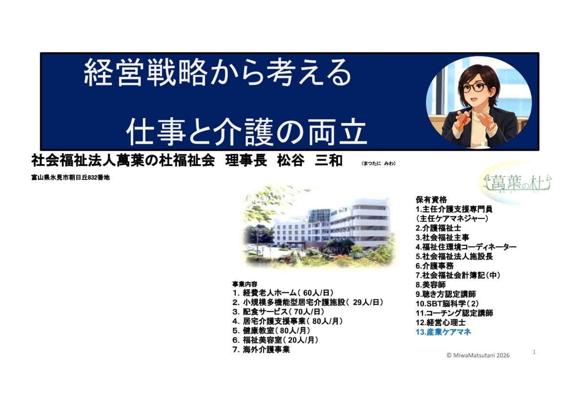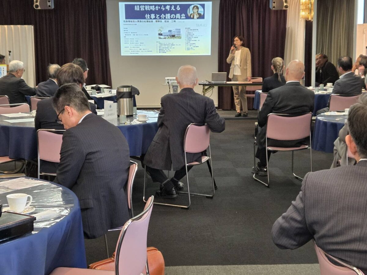 | ゲストスピーチ 社会福祉法人萬葉の杜福祉会 理事長・産業ケアマネ 松谷 三和(まつたに みわ)氏 演 題 「経営戦略から考える仕事と介護の両立」 |