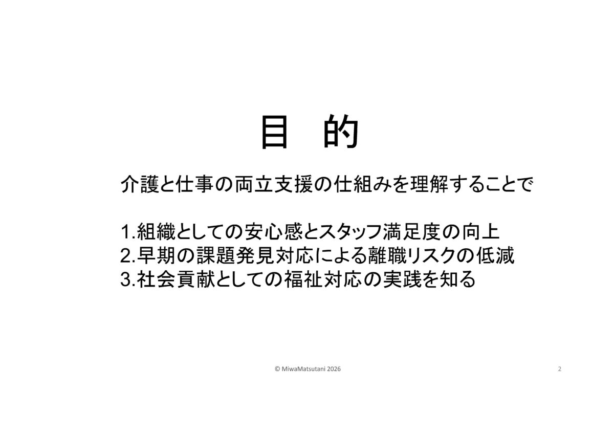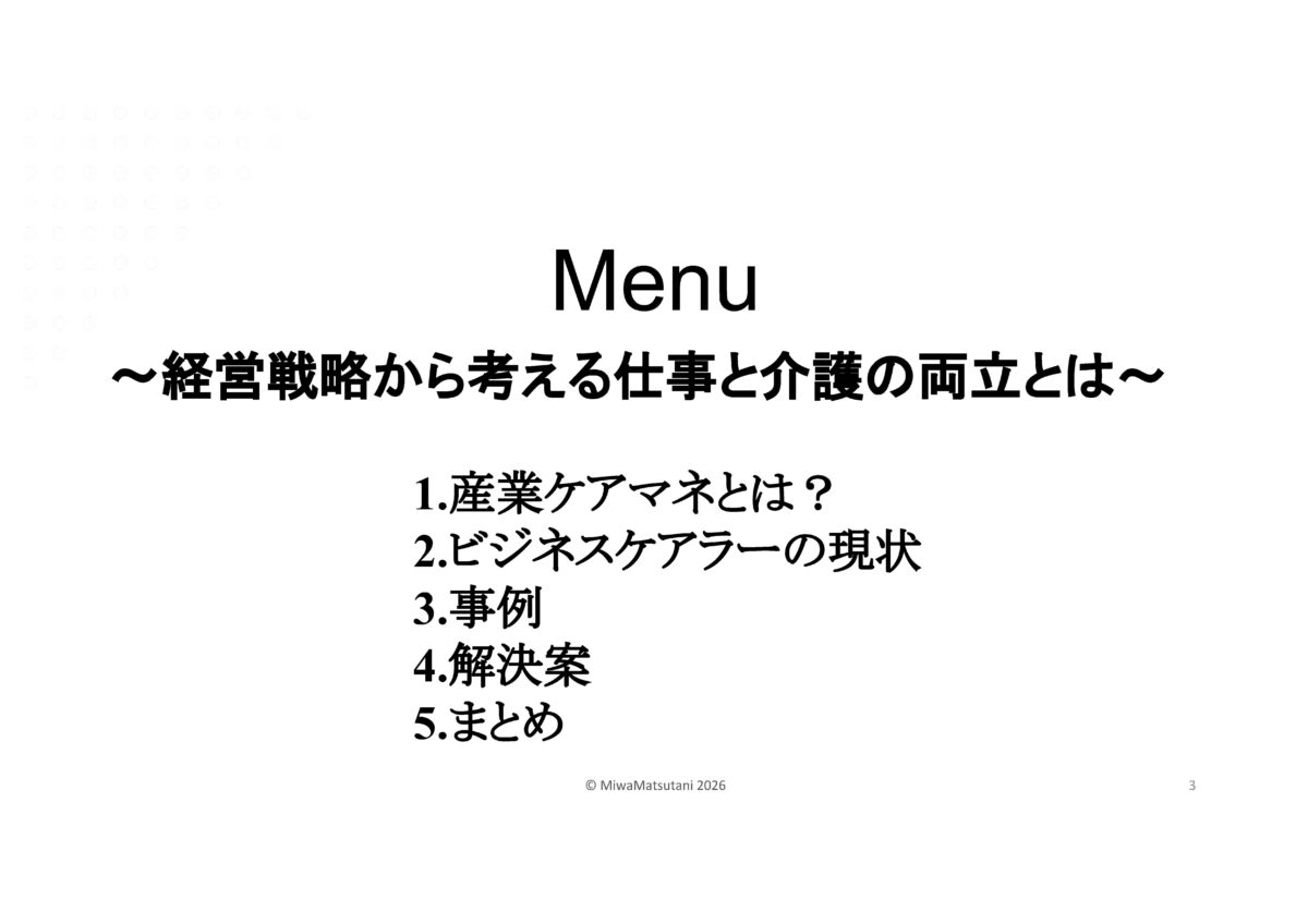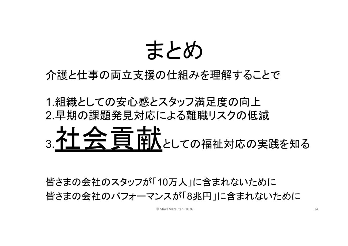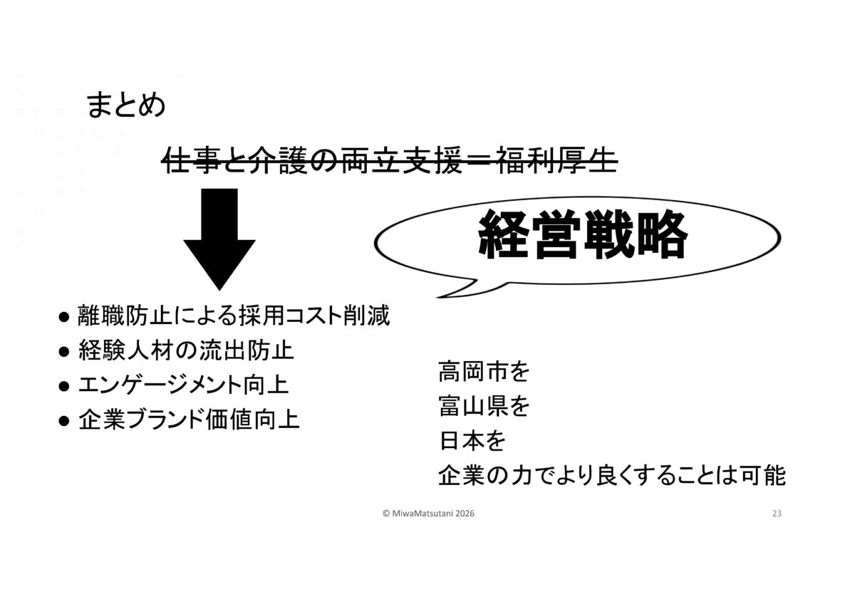 | ゲストスピーチ 社会福祉法人萬葉の杜福祉会 理事長・産業ケアマネ 松谷 三和(まつたに みわ)氏 演 題 「経営戦略から考える仕事と介護の両立」 |