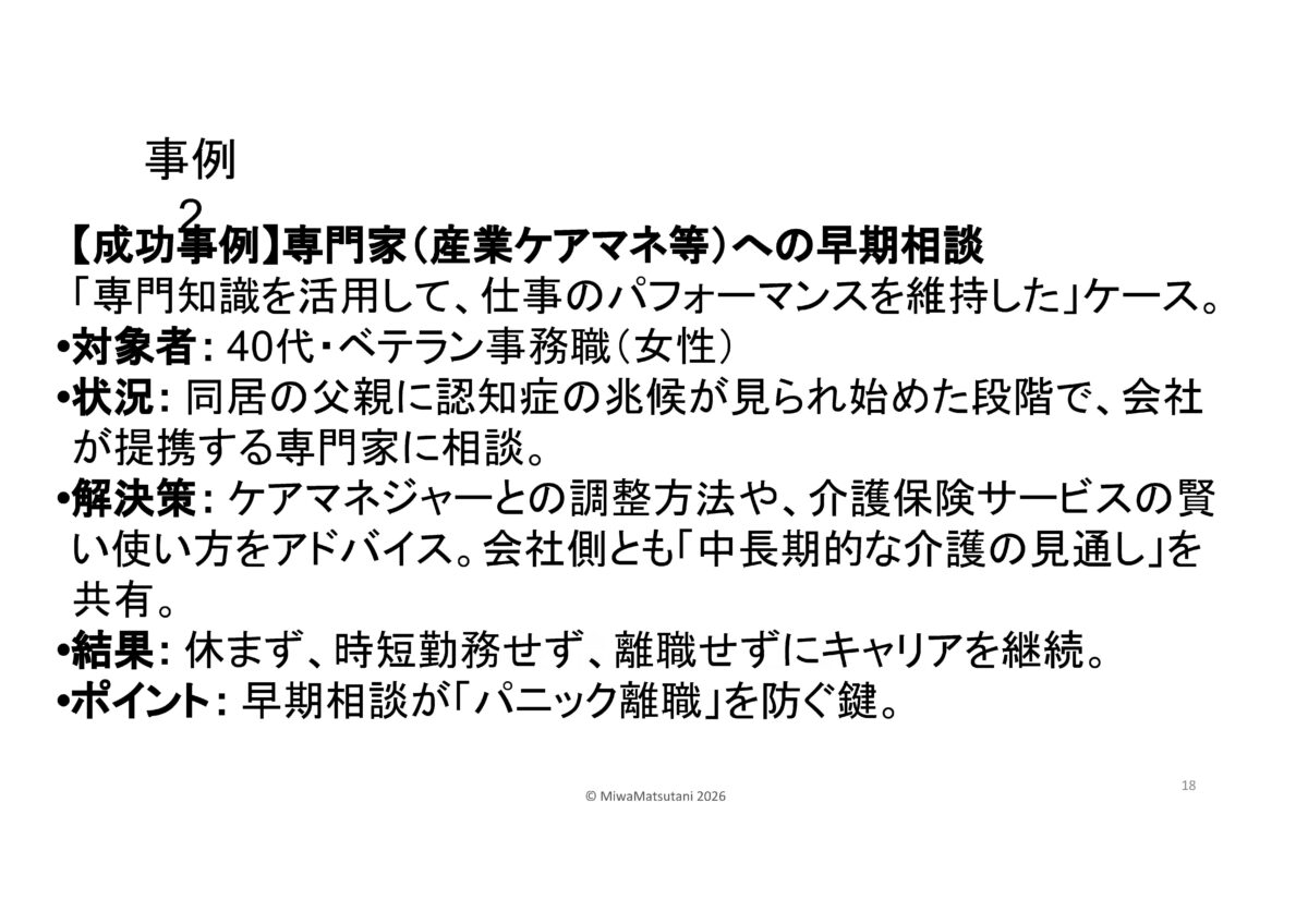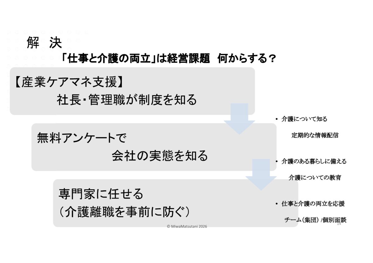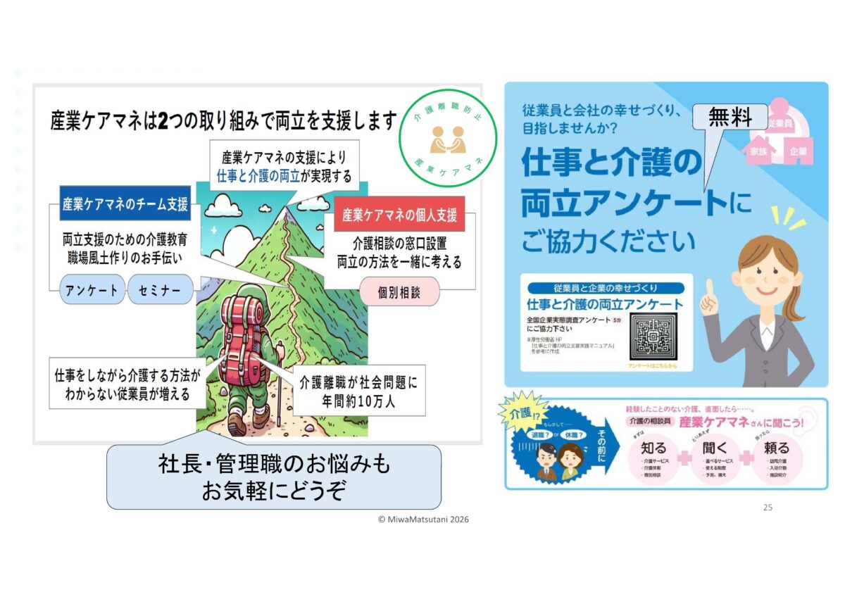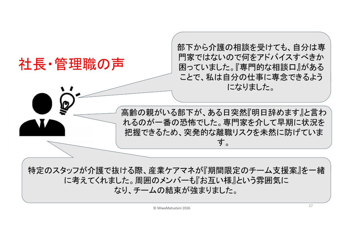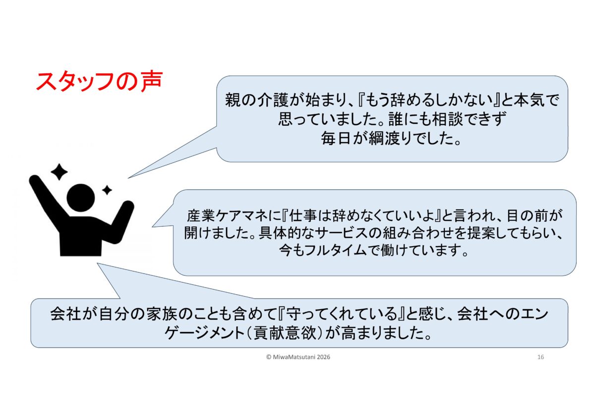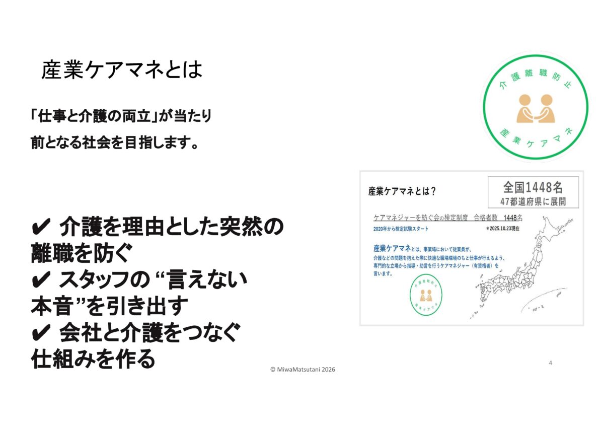 | 産業ケアマネって何?と思われた方…企業版ケアマネジャー高齢の家族を介護する従業員に対して、企業側の立場からサポートを行う専門職です。その方に来ていただきました。松谷 三和様です。 |