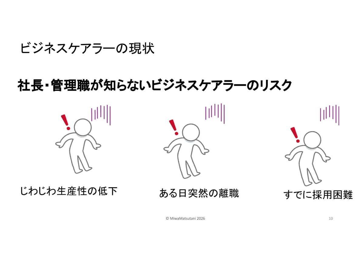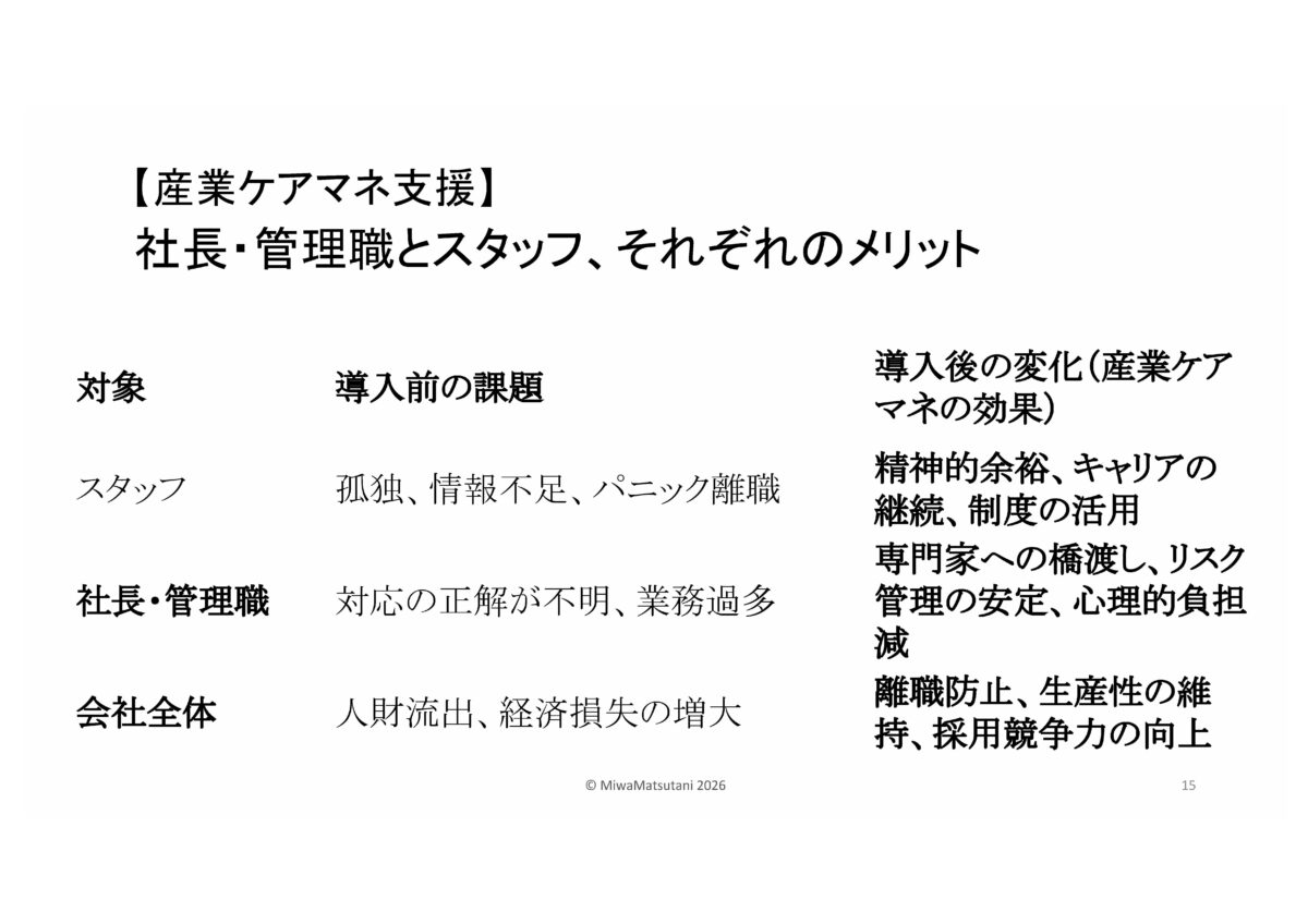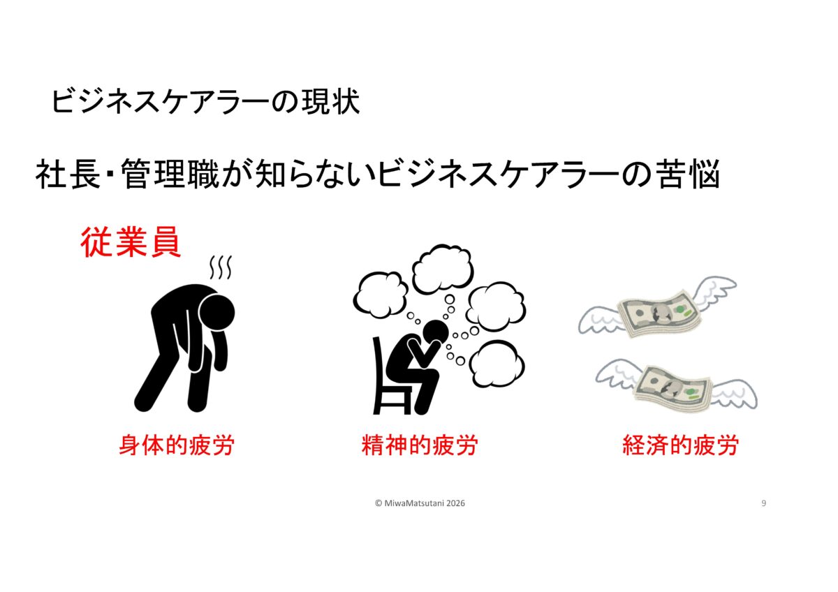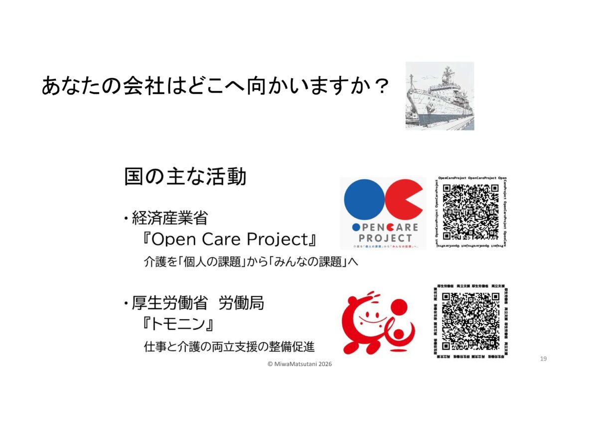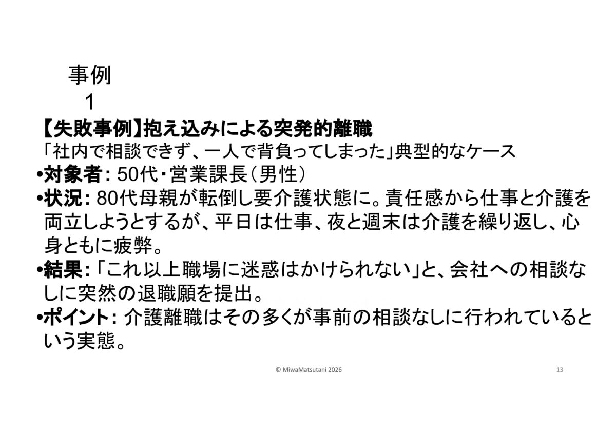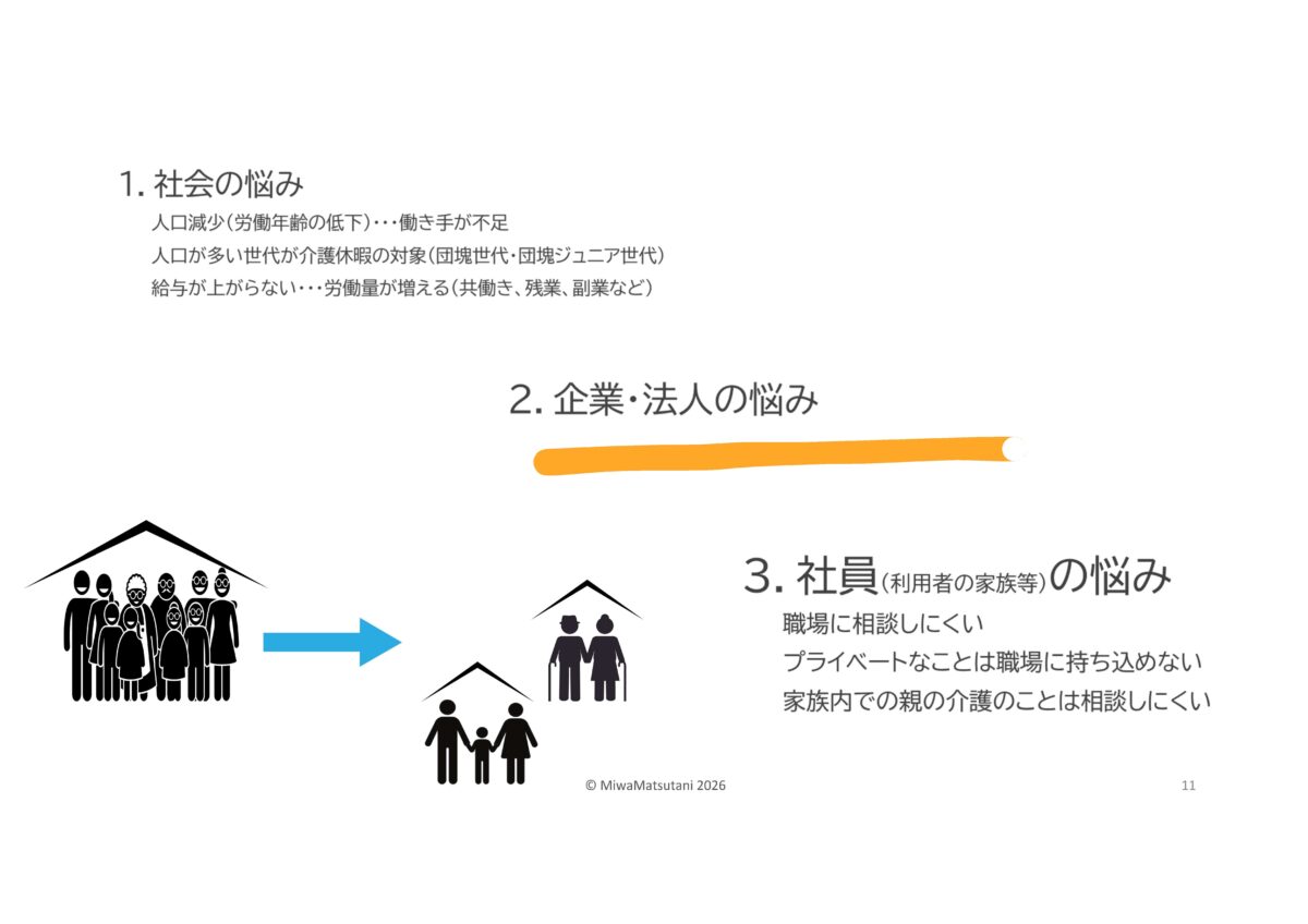 | 産業ケアマネって何?と思われた方…企業版ケアマネジャー高齢の家族を介護する従業員に対して、企業側の立場からサポートを行う専門職です。その方に来ていただきました。松谷 三和様です。 |