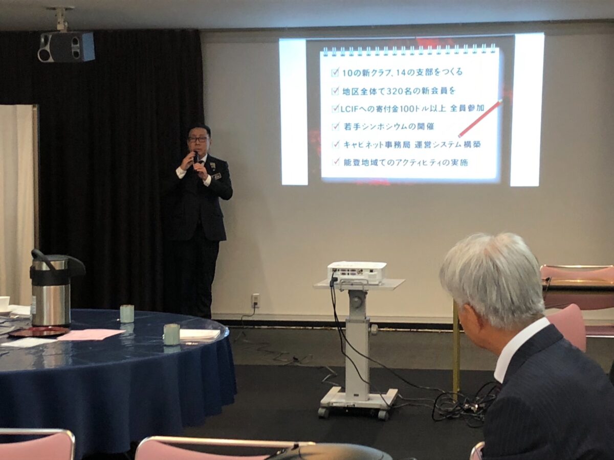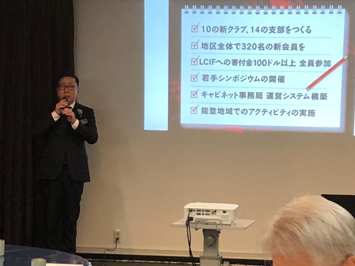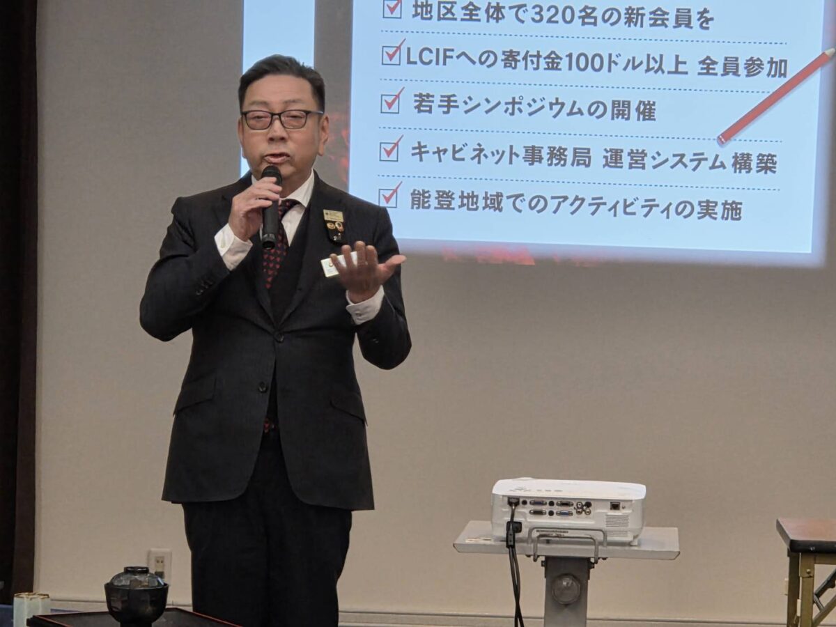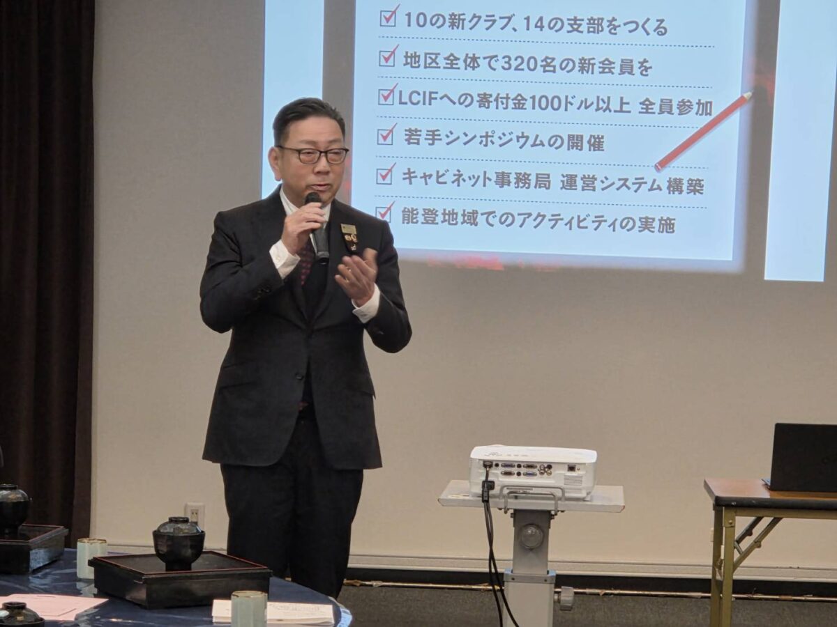 | 森川 直之ガバナーは、地区運営にあたり、明確な6つの信条を掲げておられます。 ❶10の新クラブと14の支部を立ち上げ、組織の裾野を大きく広げること。 ❷地区全体で320名の新会員を迎え入れ、次代を担う力を育てること。 ❸LCIFへの寄付を全会員100ドル以上とし、国際奉仕への確かな責任を果たすこと。 ❹若手シンポジウムを開催し、未来のリーダーを育成すること。 ➎キャビネット事務局の運営システムを構築し、強固で効率的な地区運営を実現すること。 ❻能登地域でのアクティビティを実施し、今まさに必要とされる奉仕に応えること。 これら6つの信条はいずれも、地区の未来を見据え、行動をもって示す力強い指針でございます。私たちもガバナーの思いに呼応し、一丸となって奉仕の歩みを進めてまいりたいと存じます。 |